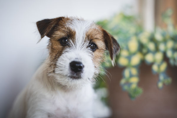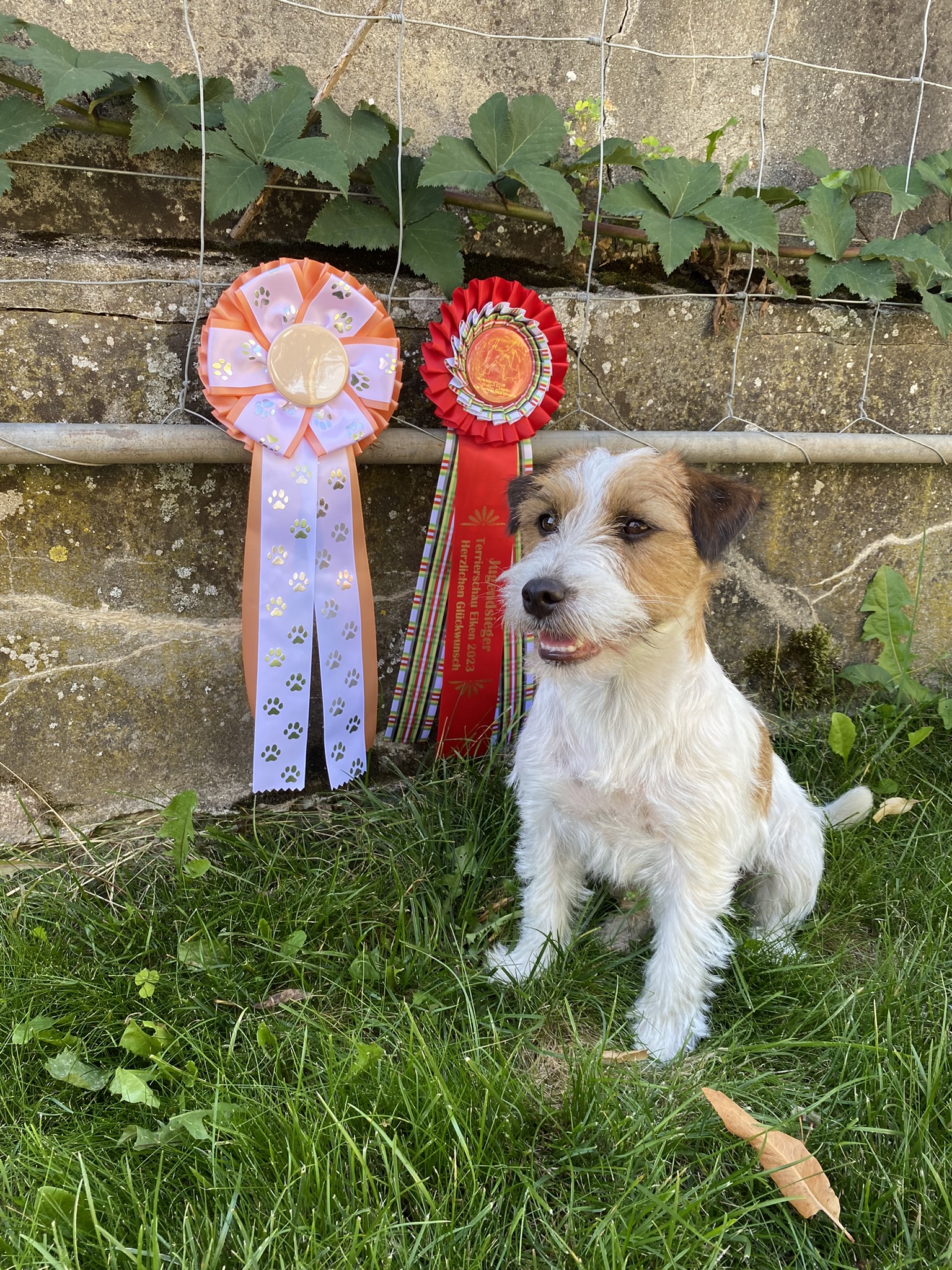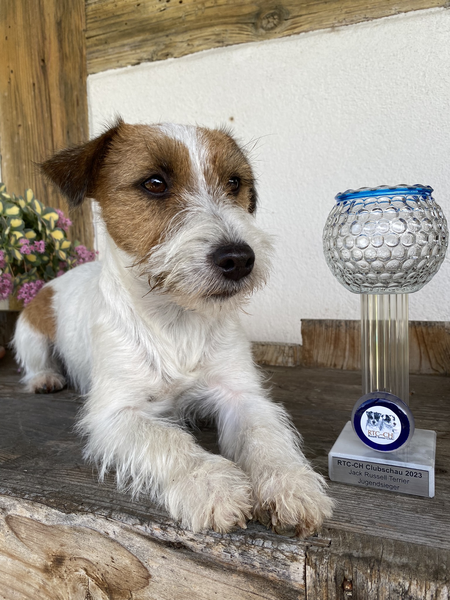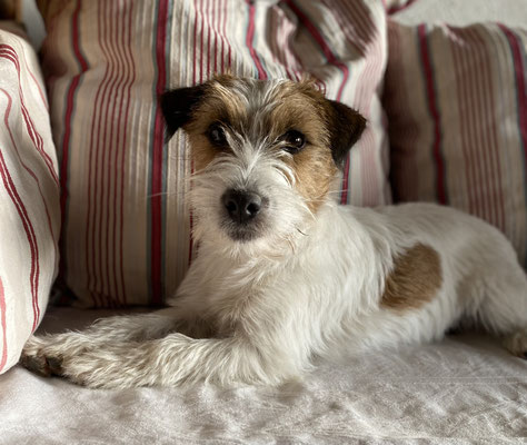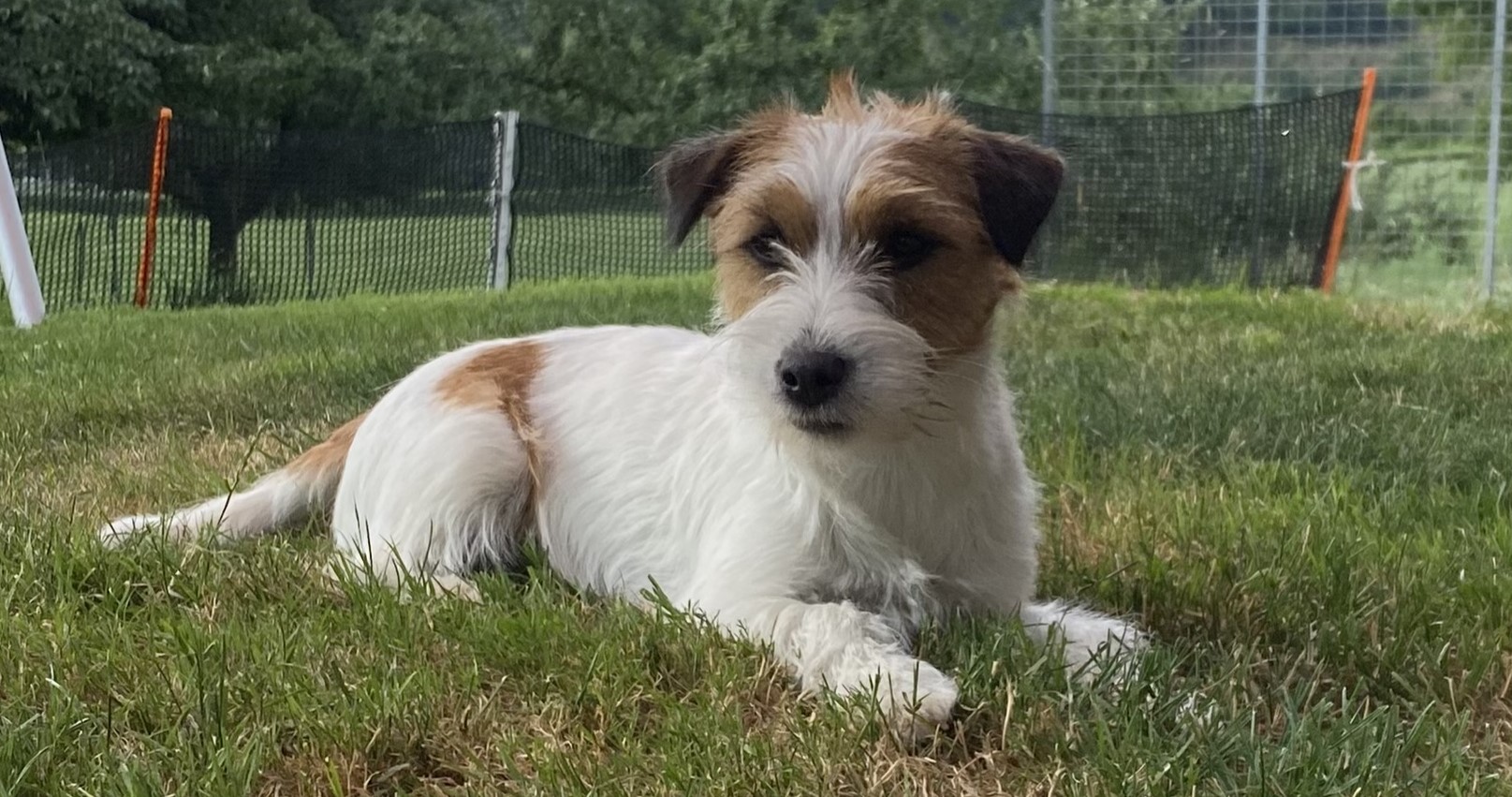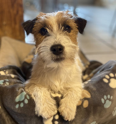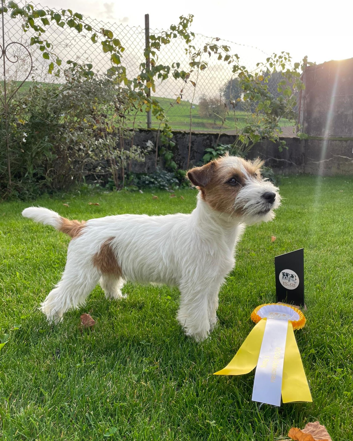Geboren: 02.06.2022, Geschlecht: Hündin, Haarkleid: rau, weiss/rot